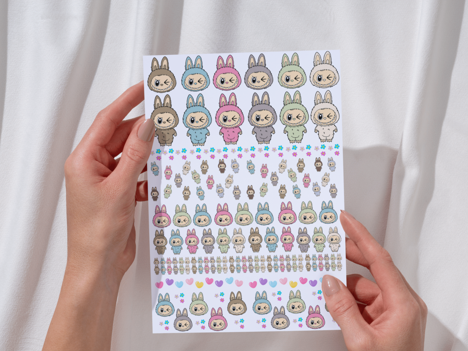 A4 size sheet of UV DTF crammed full of fluffy monsters.