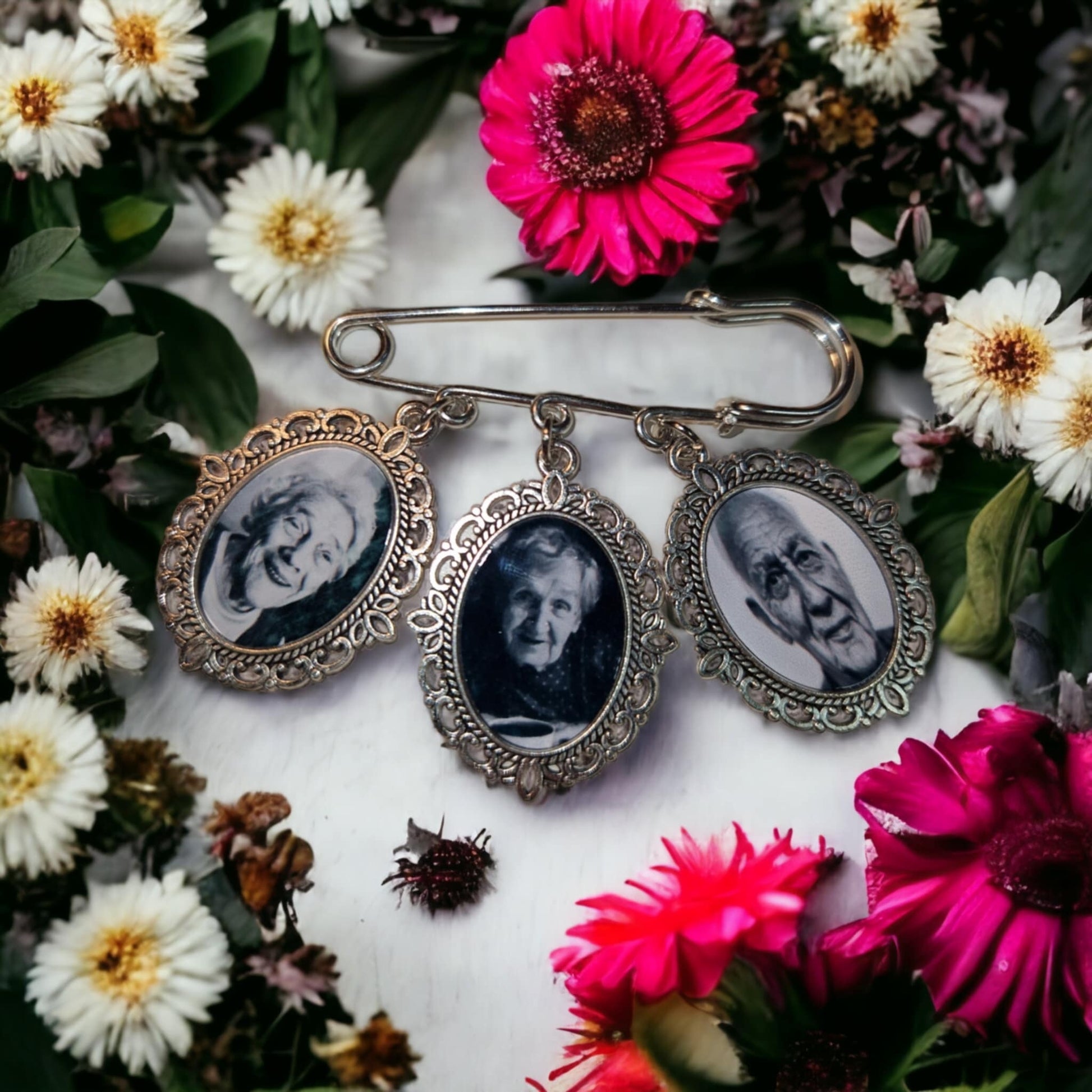 Metal pin with one three charms attached, perfect for use as memorial pin/bouquet charm etc.