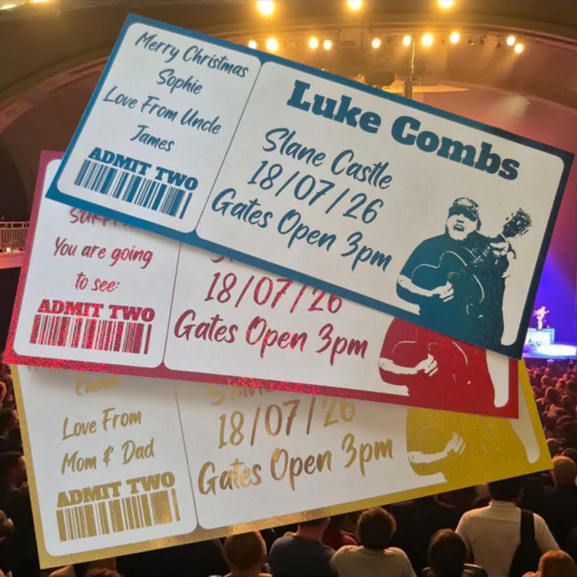 Each ticket is beautifully printed on premium glossy card and finished with a stunning metallic foil overlay, giving it that real concert-ticket shine. Whether you’re gifting real tickets or simply creating a keepsake, these custom foiled tickets are sure to impress.